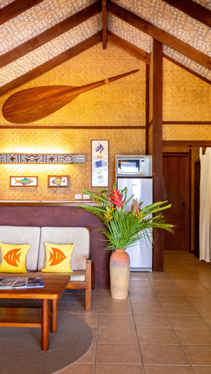 Experience a blend of retro charm and modern comfort in these bungalows. Built in 2002, they feature natural materials and a style that evokes the romantic atmosphere of the 1940s South Seas. All have bamboo interior walls, colorful Pareu cloth on the ceiling. We took special care in decorating the interiors with tropical, Polynesian, and native island objects, deliberately reflecting the romantic, old-world Polynesia of the 1930s and 40s. Each bungalow includes a bedroom, a spacious lounge, a dining area, an outdoor shower, and a kitchenette that opens onto a large, covered deck with views of the aquamarine lagoon.